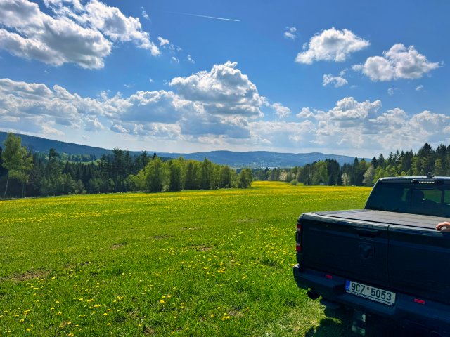 It is not possible to pass through Svatonina Lhota. The best way is through Moravice. Position on the map 48.6794501N, 14.2171492E Here turn onto the dirt road and continue to the end. Where our meadow with a view begins. Not suitable for low chassis cars. The Skoda Octavia will make it through without a problem. In the middle of this road, a puddle forms after the rains, which is max 20cm deep. It looks scary but it's easy to drive through.